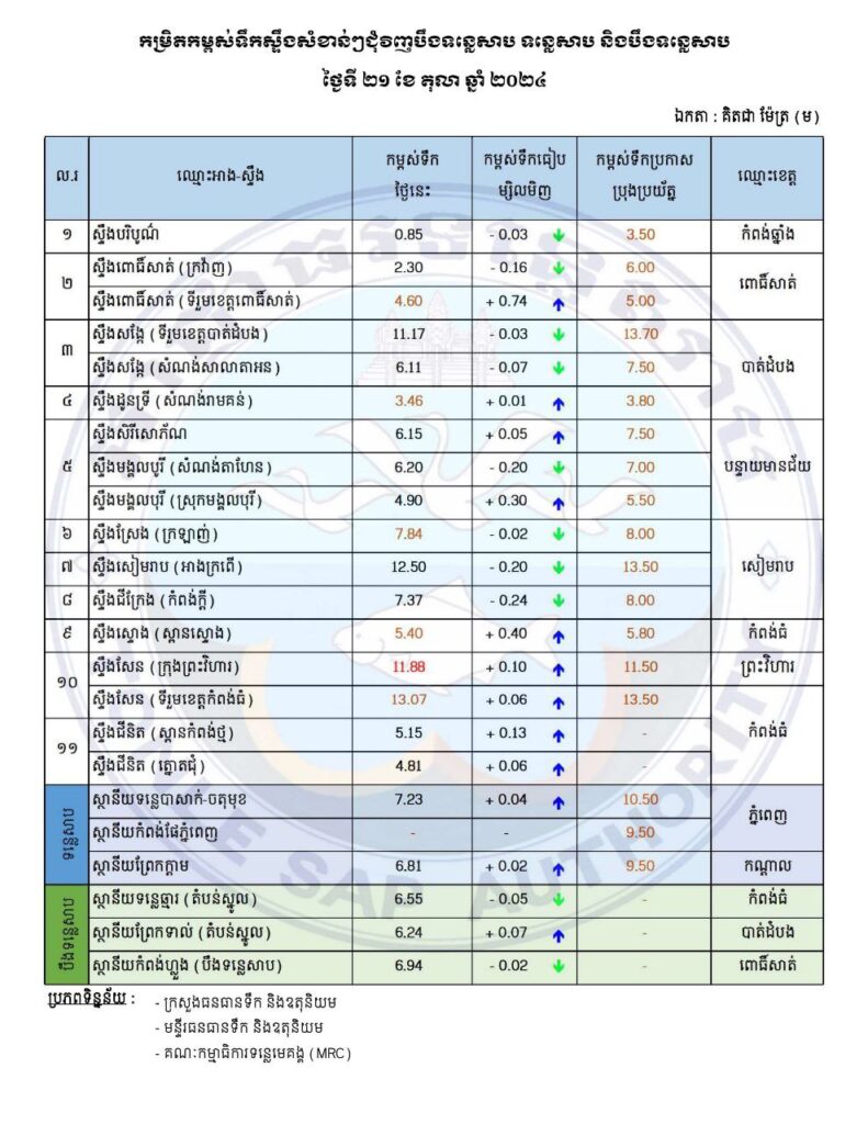 ស្ថានភាពកម្រិតទឹកស្ទឹងសំខាន់ៗទាំង១១ ជុំវិញបឹងទន្លេសាប ទន្លេសាប និងបឹងទន្លេសាប សម្រាប់ថ្ងៃទី២១ ខែតុលា ឆ្នាំ២០២៤
