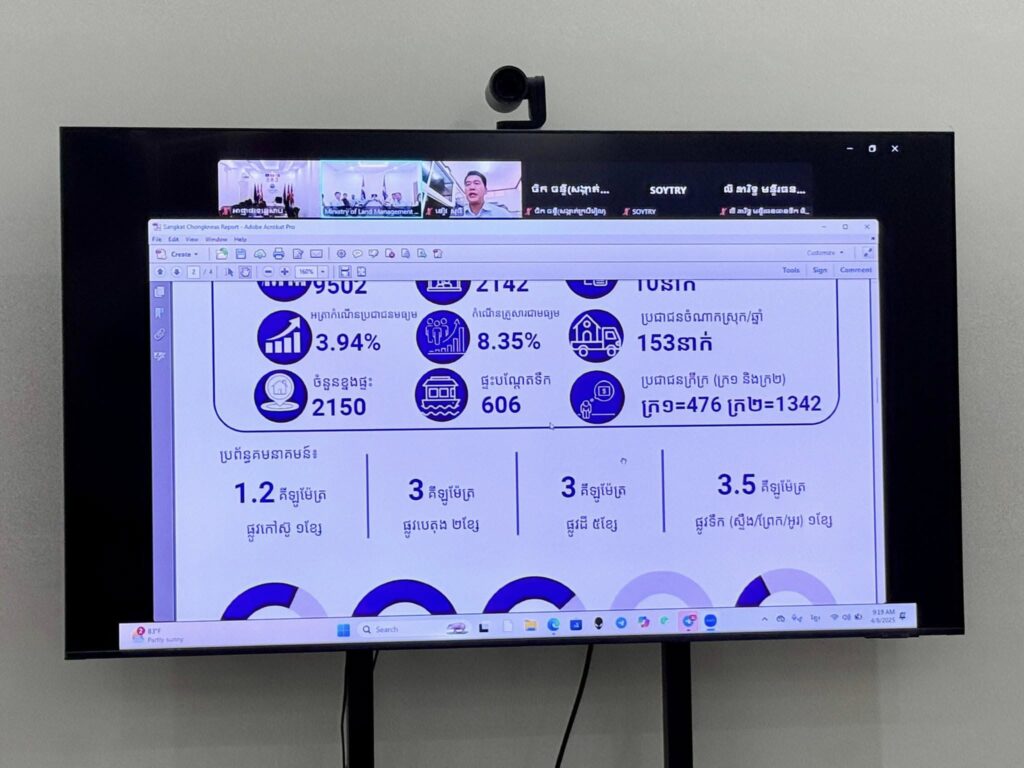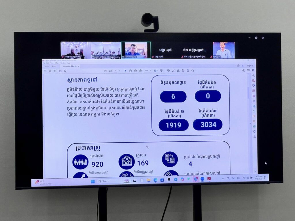 ​រាជធានី​ភ្នំពេញ​: ព្រឹក​ថ្ងៃ​អង្គារ ១១​កើត ខែចេត្រ ឆ្នាំរោង ឆស័ក ពុទ្ធសករាជ ២៥៦៨ ត្រូវ​នឹង​ថ្ងៃទី​៨ ខែមេសា ឆ្នាំ​២០២៥ ក្រុមការងារ​មន្ត្រី​បច្ចេកទេស នៃ​អាជ្ញាធរ​ទន្លេសាប តំណាង ឯកឧត្តម ហ៊ែ​ល តូ​នី អនុប្រធាន​ក្តាប់​រួម​អាជ្ញាធរ​ទន្លេសាប និង​ជា​ប្រធាន​ក្រុមការងារ​អាជ្ញាធរ​ទន្លេ​សាប​ប្រចាំ​មុខព្រួញ​ខេត្តសៀមរាប បាន​ចូលរួម​កិច្ចប្រជុំ​តាម​ប្រព័ន្ធ Zoom meeting ដើម្បី​ពិនិត្យមើល​វឌ្ឍនភាព​ការងារ​ចុះ​ពិនិត្យ ផ្ទៀងផ្ទាត់ ធ្វើ​បច្ចុប្បន្នភាព និង​ចងក្រង​ទិន្នន័យ​ដីធ្លី នៅតាម​បណ្តា​ឃុំ ស្រុក​ពាក់ព័ន្ធ ក្នុងភូមិ​សាស្ត្រ​ខេត្តសៀមរាប នៃ​តំបន់​បឹង​ទន្លេសាប ជាមួយ​ក្រុមការងារ​ម​ន្ត្រី​បច្ចេកទេស​អន្តរក្រសួង​ស្ថាប័ន​ថ្នាក់ជាតិ ថ្នាក់​ខេត្ត និង​ថ្នាក់មូលដ្ឋាន ប្រចាំ​មុខព្រួញ​ខេត្តសៀមរាប ដែល​ដឹកនាំ​ដោយ ឯកឧត្តម លាង មុនី​រិ​ទ្ធ រដ្ឋលេខាធិការ​ក្រសួង​រៀបចំ​ដែនដី នគរូបនីយកម្ម និង​សំណង់​៕