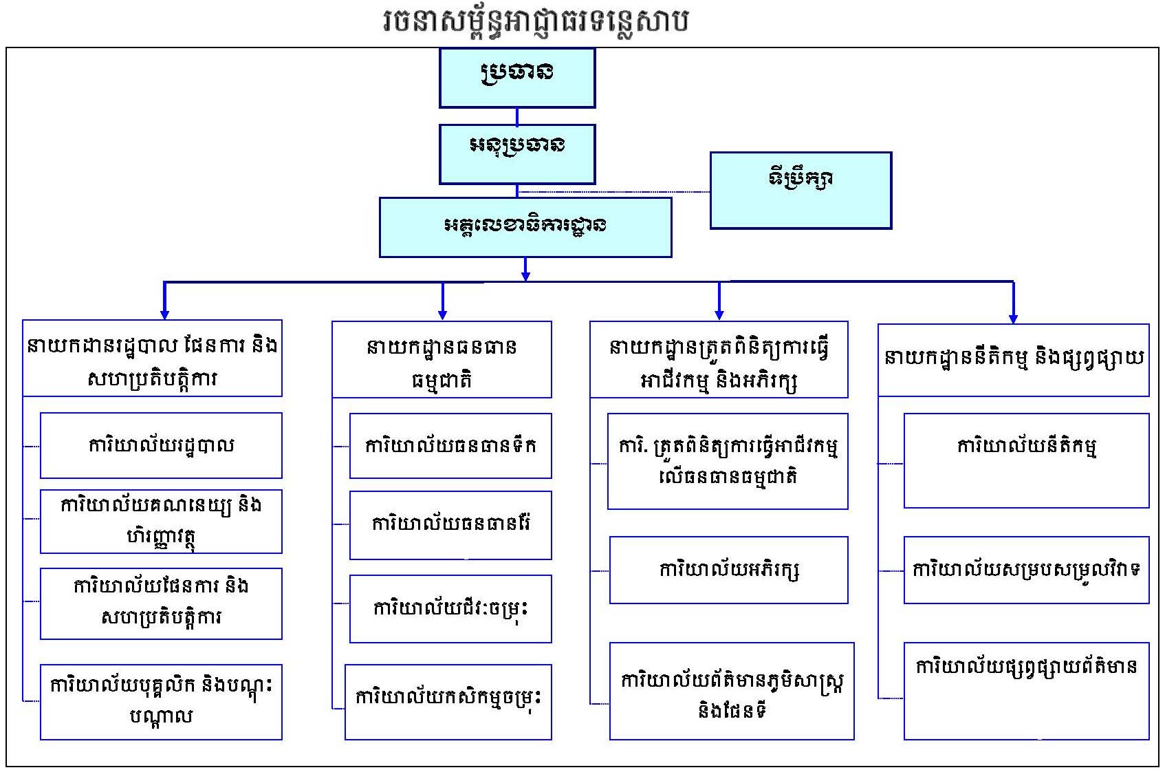 យោងតាមឧបសម្ព័ន្ធនៃ​ អនុក្រឹត្យលេខ ១១៦ អនក្រ.បក ចុះថ្ងៃទី ៣០ ខែ កក្កដា ឆ្នាំ ២០០៩ អង្គការលេខរបស់អាជ្ញាធរទន្លេសាប មានដូចខាងក្រោម៖