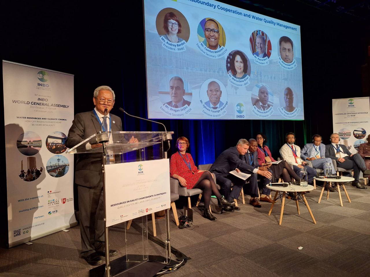 នាថ្ងៃពុធ ៧កើត ខែអស្សុជ ឆ្នាំរោង ឆស័ក ពុទ្ធសករាជ ២៥៦៨ ត្រូវនឹងថ្ងៃទី ៩ ខែតុលា ឆ្នាំ២០២៤ នៅទីក្រុង Bordeaux ប្រទេសបារាំង ឯកឧត្តមសាស្ត្រាចារ្យ លឹម ពុយ អនុប្រធានអាជ្ញាធរទន្លេសាប ដោយមានការអនុញ្ញាតដ៏ខ្ពង់ខ្ពស់ពីឯកឧត្តម ថោ ជេដ្ឋា ប្រធានអាជ្ញាធរទន្លេសាប បានអញ្ជើញចូលរួមក្នុងមហាសន្និបាតពិភពលោក និងចូលរួមធ្វើជាអ្នកសម្របសម្រួលលើប្រធានបទ «កិច្ចសហប្រតិបត្តិការឆ្លងដែនរបស់ទន្លេ និងការគ្រប់គ្រង នៃគុណភាពទឹក» ក្នុងមហាសន្និបាតពិភពលោកស្តីពី ការគ្រប់គ្រងអាងទន្លេ (World General Assembly on Basin Management) ដែលរៀបចំដោយ International Network of Basin Organization (INBO) លើប្រធានបទធនធានទឹក និងការប្រែប្រួលអាកាសធាតុ៖ តើការគ្រប់គ្រងអាងទន្លេដោយបន្ស៉ាំនឹងការប្រែប្រួលអាកាសធាតុត្រូវធ្វើដោយរបៀបណា? ។